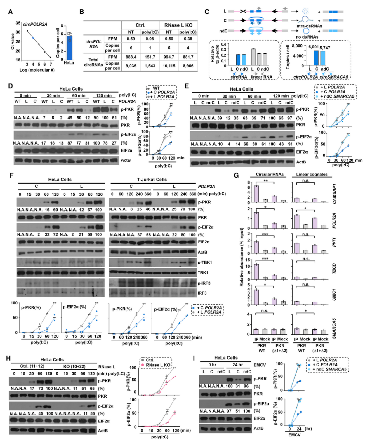 经过上述的体外实验,初步表明circRNA分子内部的小颈环结构可以结合PKR并抑制其自磷酸化,那么这种机制是否也在细胞内存在呢?为了验证相关的机制,作者在Hela细胞中分别过表达线性和环状的POLR2A分子,然后用poly(I:C)处理,看PKR磷酸化的状态。结果表明单独过表达circPOLR2A能明显降低poly(I:C)处理后PKR的磷酸化。但换成另一种不带分子内小颈环结构的circRNA分子,circSMARCA5则不能影响PKR的磷酸化过程。在RNase L敲除的细胞中,poly(I:C)处理诱导的PKR激活作用显著减弱。