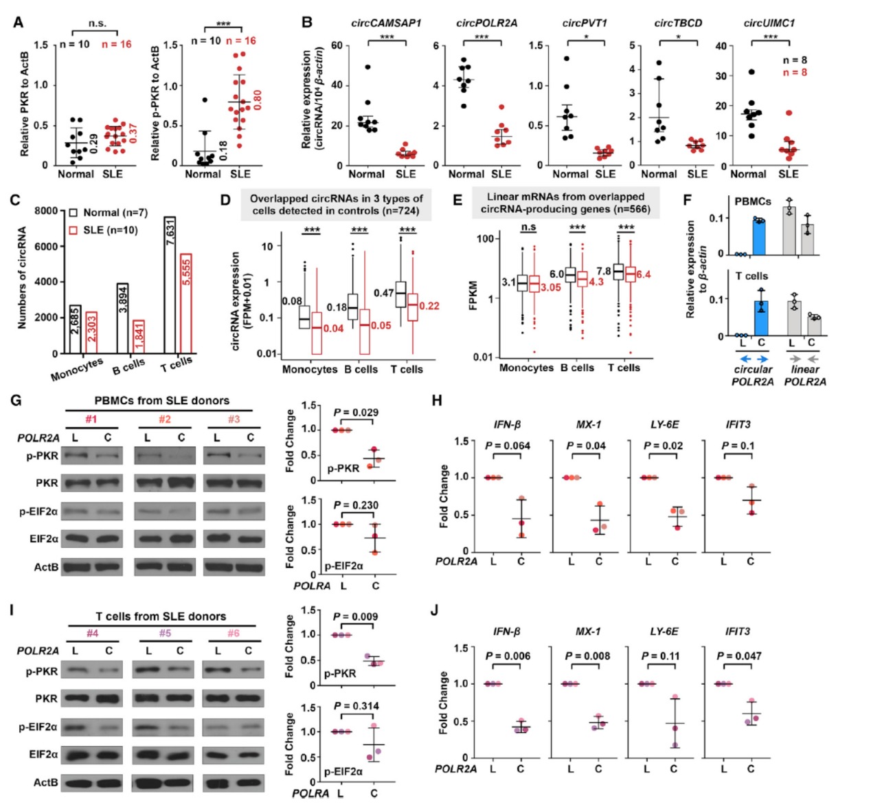 系统性红斑狼疮(SLE)是常见的自身免疫疾病,表现为过度的免疫激活反应,SLE患者表现出PKR的过度激活状态。作者分析了SLE与健康对照者PKR蛋白表达和磷酸化状态,结果表明SLE患者PBMC中PKR的蛋白表达有微弱上调,但其磷酸化状态显著升高。QPCR结果表明SLE患者中具有内部小颈环结构的几种circRNA表达丰度显著降低,RNA-seq分析单核细胞,B细胞和T细胞中circRNA的丰度,结果表明在B细胞和T细胞中circRNA总体丰度下降。是否在SLE的病人中circRNA的降低是导致PKR过度激活的因素?于是作者选择了三个SLE患者,分离PBMC后瞬转过表达线性或环状的POLR2A,分析PKR的磷酸化情况,结果表明过表达circPOLR2A能够降低PBMC中的PKR磷酸化状态。单独分离SLE的T细胞做相应的过表达实验也表明SLE中过表达带内部小颈环结构的circRNA可以降低PKR的磷酸化水平。