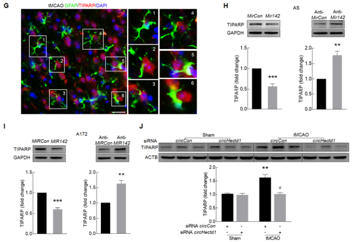 通过TargetScan筛选MIR142的候选靶基因,发现大多数物种中MIR142可结合TIPARP的3′-UTR保守序列的情况(A),荧光素酶报告基因实验也证明了这个结合能力(B);同时基因组表达谱、RT-PCR和WB检测分析,同样证明在tMCAO小鼠模型中TIPARP的表达水平是上调的(C-F);在小鼠大脑皮质中GFAP 和TIPARP蛋白的共定位情况(G);体外敲低MIR142可以促进TIPARP的蛋白表达水平,而给予MIR142模拟物可以降低TIPARP的蛋白表达水平(H-I)。tMCAO小鼠模型中,给予circHectd1 siRNA慢病毒注射可以抑制原本上调的TIPARP的蛋白表达水平(J),以上结果提示circHECTD1-MIR142通路下游的靶基因是TIPARP。