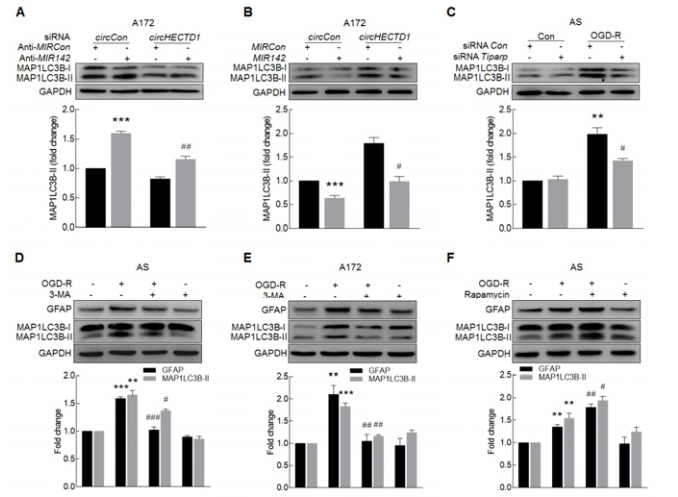 体外给予AS和A172细胞OGD-R处理后,胞内自噬相关Beclin 1和LC3B-II蛋白水平上调,p62蛋白水平下调,提示细胞内自噬流增加(A-B);通过转染胶质细胞mRFP-GFP-MAP1LC3B腺病毒,confocal成像追踪细胞活化后自噬流的变化,OGD-R处理细胞后自噬溶酶体增加,自噬流增加(C);体外敲低circHectd1表达抑制OGD-R诱导MAP1LC3BII的蛋白表达,即抑制细胞的自噬(D-F);体内敲低circHectd1表达抑制tMCAO小鼠中MAP1LC3BII的蛋白表达,以上结果证明了抑制circHECTD1的表达会抑制星型胶质细胞的活化。