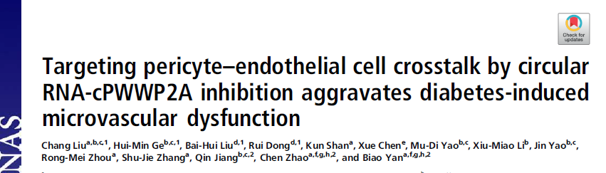 - Liu C, Ge HM, Liu BH, et al. Targeting pericyte-endothelial cell crosstalk by circular RNA-cPWWP2A inhibition aggravates diabetes-induced microvascular dysfunction. Proc Natl Acad Sci U S A. 2019 Mar 26. pii: 201814874. doi: 10.1073/pnas.1814874116.