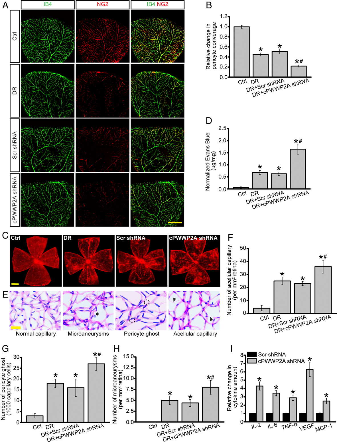 免疫荧光染色(绿色代表血管,红色代表周细胞)证明敲低cPWWP2A表达可以明显降低视网膜血管中周细胞的覆盖水平;Evans blue实验证明与糖尿病小鼠的视网膜相比,敲低cPWWP2A表达会明显加重糖尿病引起视网膜的血管渗漏;糖尿病视网膜的重要特征包括周细胞丢失、小动脉瘤和非细胞组成的微血管。胰蛋白酶消化视网膜血管实验发现,敲低cPWWP2A表达进一步增加了糖尿病视网膜的中非细胞组成的血管、周细胞丢失和微动脉瘤的数量;ELISAs实验证明敲低cPWWP2A表达还会促进炎症因子IL-2, IL6, TNF-α, VEGF和MCP-1的分泌,加重糖尿病诱导的视网膜炎症反应。但是如果过表达cPWWP2A则出现相反的结果,起到保护周细胞免受糖尿病诱导视网膜损伤的作用。