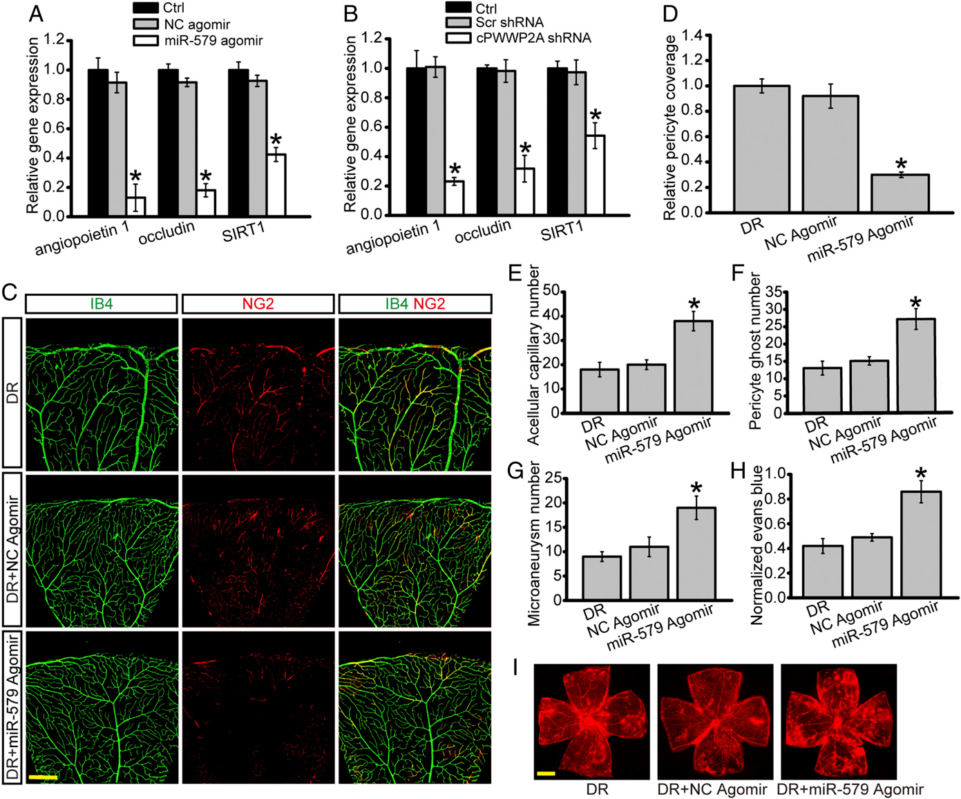 应用miR-579激动剂或者敲低cPWWP2A表达都可明显抑制小鼠视网膜中Angiopoietin 1/Occludin/SIRT1基因的表达。应用miR-579激动剂明显降低视网膜血管中周细胞的覆盖水平,增加糖尿病小鼠视网膜的中非细胞组成的血管、周细胞丢失和微动脉瘤的数量,明显加重糖尿病引起视网膜的血管渗漏。而应用miR-579拮抗剂则获得与之相反的结果。之前的结果已经证明敲低cPWWP2A表达可造成视网膜血管功能障碍,而当同时注射外源性miR-579拮抗剂则会抵消这血管功能障碍的负面效应。