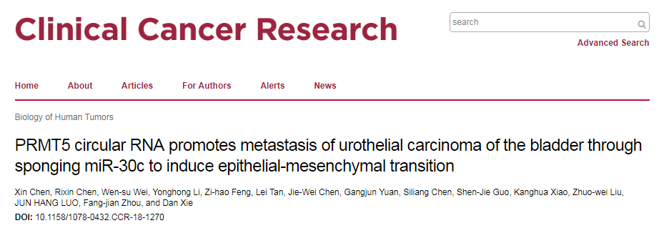 - Chen X, et al. PRMT5 Circular RNA Promotes Metastasis of Urothelial Carcinoma of the Bladder through Sponging miR-30c to Induce Epithelial-Mesenchymal Transition. Clin Cancer Res. 2018 Oct 10. doi: 10.1158/1078-0432.CCR-18-1270.