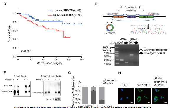 作者对三对UCB组织样本和其相应正常组织样本进行circRNA芯片分析,发现37种circRNAs表达上调,43种circRNAs表达下调(A);分层聚类分析了上调水平最大的前15种和下调水平最大的前15种circRNAs(B);其中circRNA_101320表达水平上调高达6倍以上,通过比对GRCh37/hg19基因组,发现其来源于染色体14q11.2中的PRMT5基因,故命名为circPRMT5。为明确其临床意义,RT-qPCR检测UCB组织样本,发现在UCBs样本中circPRMT5表达水平明显上调,而且相比于无发生转移样本,发生淋巴结转移的样本中circPRMT5表达水平也相对偏高(C);进一步临床统计分析显示上调的circPRMT5水平与患者的无疾病生存期DFS呈负相关(D)。Sanger测序RT-PCR产物证明了circPRMT5是由5’端7号和6号外显子与 3’端的5号外显子连接而成(E),同时利用靶向7号和5号外显子连接序列探针、7号外显子的探针进行杂交实验,证明了circPRMT5的存在,而且不同于线性PRMT5,RNase R处理说明circPRMT5是环状RNA,可以耐受RNase R(F)。mRNA成分分离和FISH实验都证明了circPRMT5主要存在于胞浆中(G,H)。