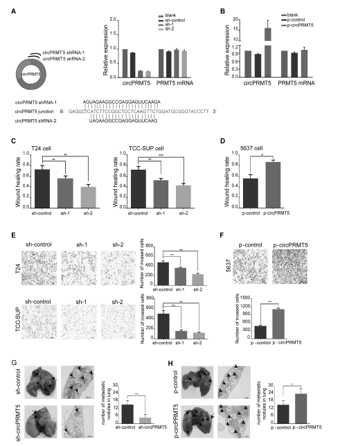 在UCB细胞(T24, TCC-SUP, 5637)中,circPRMT5过表达和敲低的效果很明显,而且都不会影响其对应基因的mRNA的表达(A,B) ;体外实验证明circPRMT5过表达可以明显促进UCB 5637细胞的迁移和侵袭;而circPRMT5敲低可以明显抑制UCB 5637细胞的迁移和侵袭(C-F);体内实验(尾静脉回输circPRMT5过表达和敲低的UCB细胞后,观察其发生肺转移的情况)证明,circPRMT5过表达的UCB细胞发生肺转移的情况更严重;而circPRMT5敲低的UCB细胞发生肺转移的情况明显减轻(G-H)。