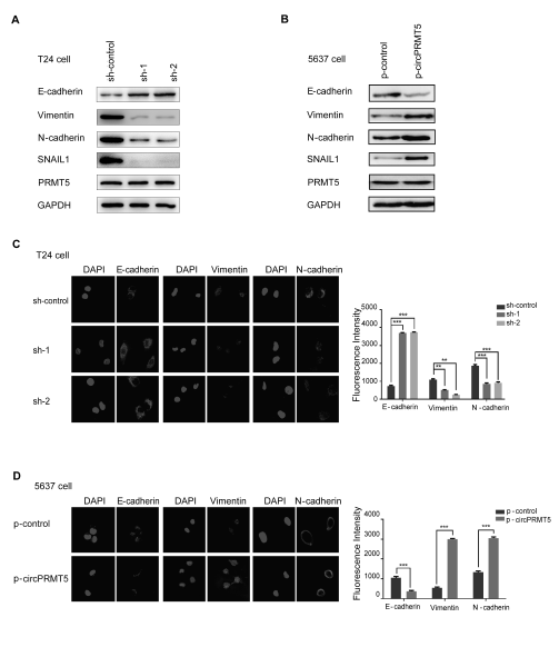 在UCB细胞中敲低circPRMT5后,WB检测发现上皮marker—E-cadherin表达水平明显增加,而间质marker—Vimentin 和N-cadherin表达水平明显下调(A);而在UCB细胞中过表达circPRMT5会下调E-cadherin的表达,上调Vimentin 和N-cadherin表达(B)。另外在T24细胞中敲低circPRMT5和5637细胞中过表达circPRMT5后,FISH免疫荧光杂交实验也证明了与WB同样的结果(C-D)。这些结果提示,circPRTM5可以促进UCB细胞的EMT进程,而且该过程不依赖于PRMT5 mRNA。