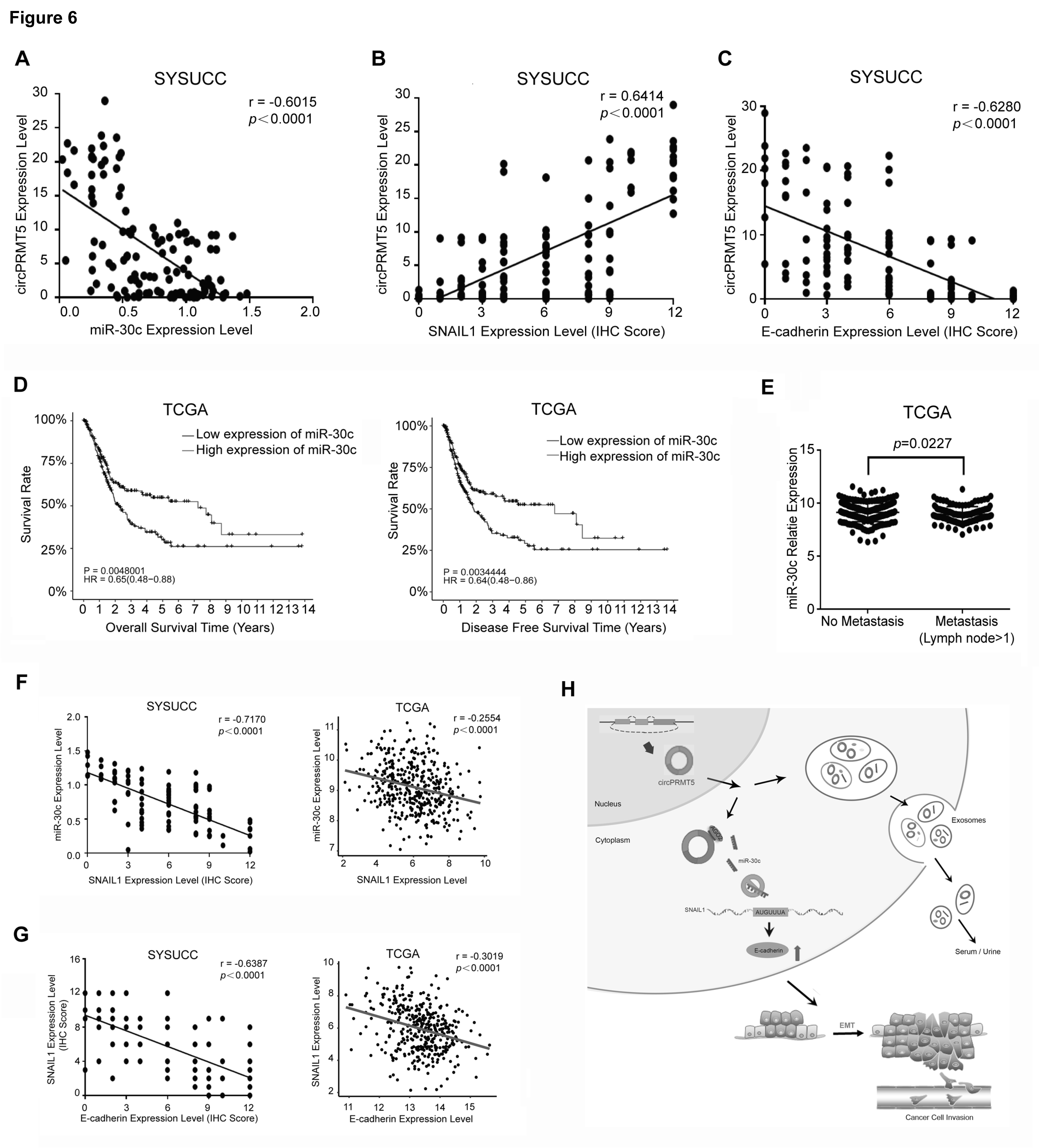 通过对收集的临床数据进行统计分析,circPRMT5与miR-30c表达水平成负相关(A);高表达的circPRMT5与SNAIL1表达水平成正相关,而与E-cadherin的表达水平成负相关(B,C)。为明确miR-30c通路对于UCB患者的临床意义,通过TCGA数据分析,发现miR-30c表达水平与患者的OS和DFS生存期成正相关(D),而且无发生转移的UCB患者的miR-30c表达水平明显上调(E),进一步提示了miR-30c对UCB发展的抑制作用;临床数据统计和TCGA数据分析显示,miR-30c表达水平与SNAIL1表达水平成负相关,而SNAIL1表达水平与E-cadherin的表达水平成负相关(F,G)。