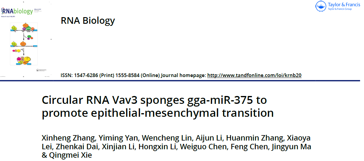 最近来自华南农业大学动物科学学院的谢青梅教授研究团队最近在RNA Biol(IF=5.216)上在线发表了题为Circular RNA Vav3 sponges gga-miR-375 to promote epithelial-mesenchymal transition的研究[1],首次报道了感染了逆转录病毒ALV-J的鸡禽类的肿瘤肝中存在表达水平上调的circ-Vav3。因为通讯作者之前的研究工作发现,在感染了ALV-J的鸡禽类的肝肿瘤中,通过microRNA芯片结果检测显示gga-miR-375的表达水平明显下调,带着gga-miR-375是否与某种circRNAs有直接联系的疑问,作者证明了circ-Vav3可以结合和海绵gga-miR-375,上调gga-miR-375靶向的基因YAP1的表达,从而调控EMT相关基因的表达,诱导EMT的发生,这些结果提示circ-Vav3/gga-miR-375/YAP1轴对于ALV-J诱导的肿瘤发生有着重要的意义。