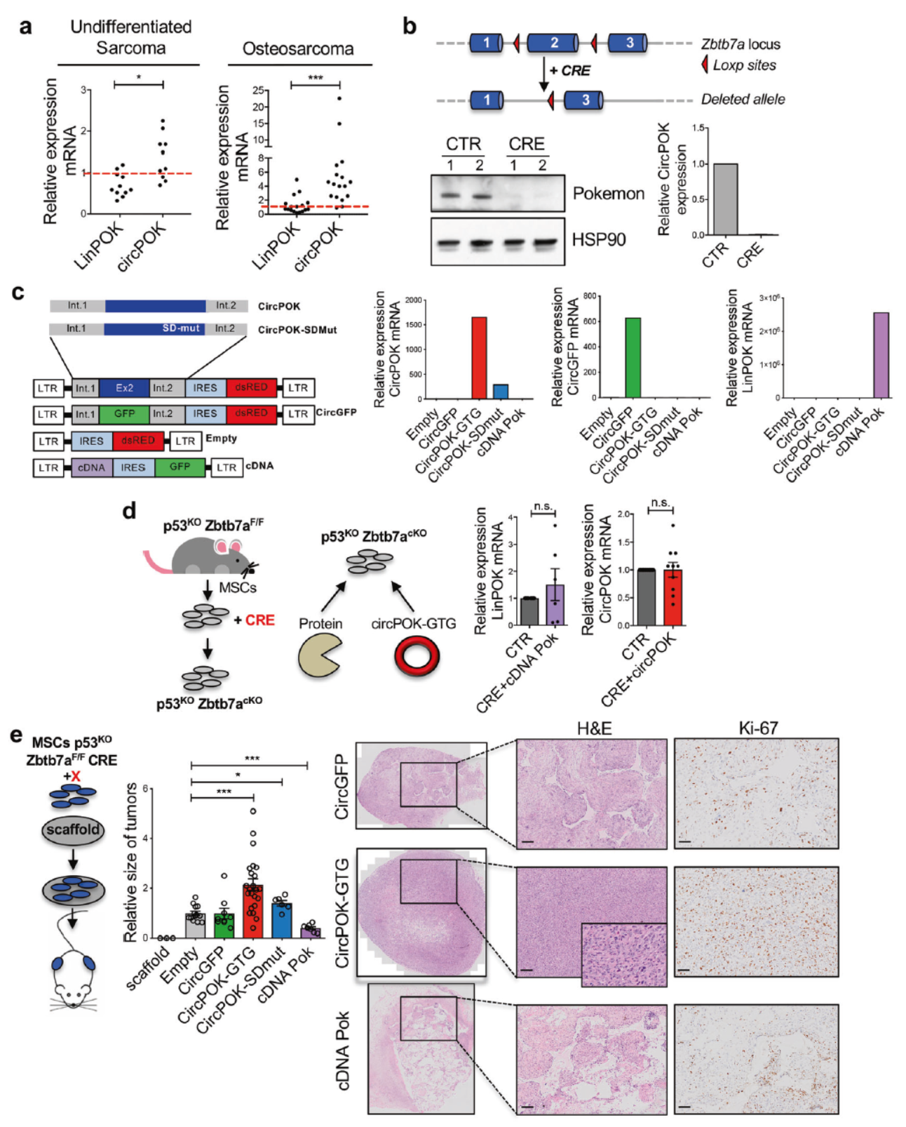 作者分离了p53−/−, Zbtb7a_Ex2F/F小鼠的MSC细胞,先通过病毒载体表达了Cre酶,实现第二外显子的敲除(Pokemon蛋白和circPOK被同时敲除了),然后分别回补表达Pokemon蛋白和circPOK,这样就可以分析Pokemon蛋白和circPOK的功能了。分别将表达Pokemon蛋白或circPOK以及相关的对照细胞分别注射小鼠,分析形成肿瘤的大小,结果发现,过表达Pokemon蛋白可以抑制肿瘤的形成,但过表达circPOK却可以促进肿瘤的生长。