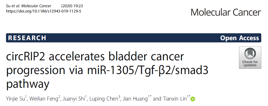 - Yinjie Su., et al., circRIP2 accelerates bladder cancer progression via miR-1305/ Tgf-β2/ smad3 pathway. Mol Cancer. 2020; 19: 23.