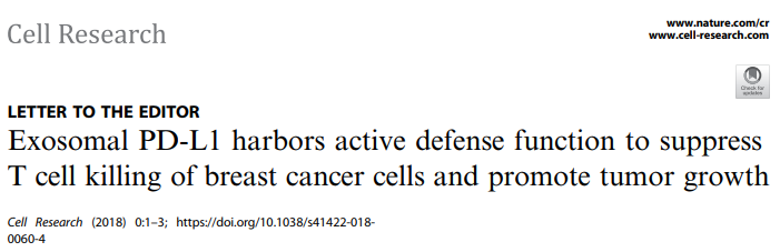 1. Yang Y, et al.. Exosomal PD-L1 harbors active defense function to suppress T cell killing of breast cancer cells and promote tumor growth[J]. Cell Research. 2018. DOI: 10.1038/s41422-018-0060-4.