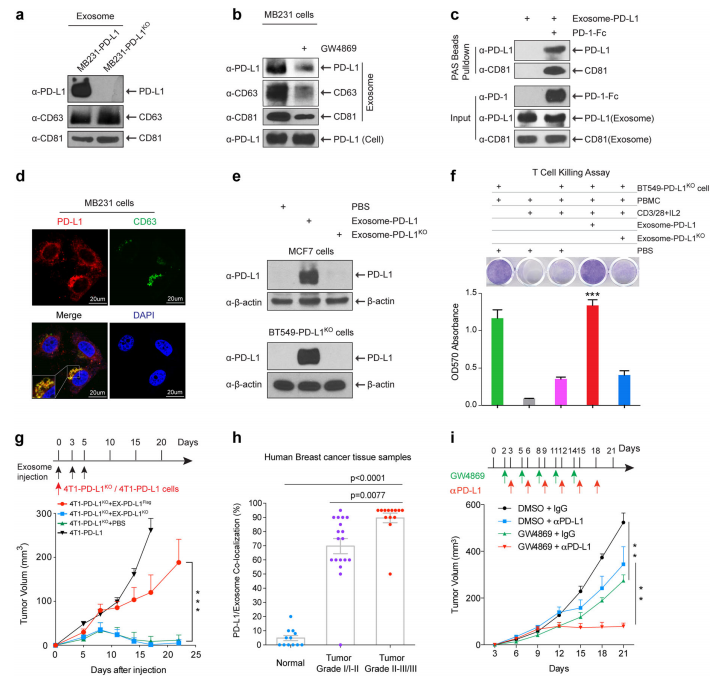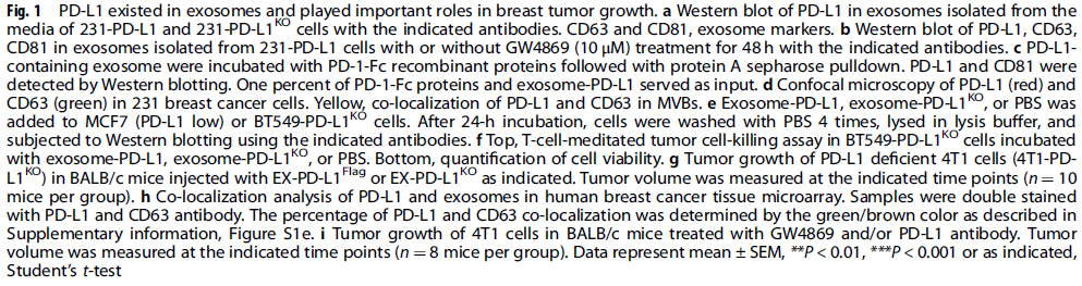 作者对人乳腺癌细胞(MDA-MB-231)和小鼠乳腺癌细胞系(4T1)进行PD-L1的分别过表达和敲除后,差速超速离心分离细胞培养上清中的富含PD-L1的外泌体 (exosome-PD-L1)和无PD-L1的外泌体 (exosome-PD-L1KO),进行了透射电镜鉴定形态和WB鉴定外泌体marker蛋白的表达情况(a)。给予外泌体分泌抑制剂GW4869处理肿瘤细胞后,其分泌外泌体的marker蛋白和PD-L1蛋白的表达都下调,而肿瘤细胞裂解物中的PD-L1总蛋白无明显变化(b)。另外体外结合实验发现,PD-1-Fc蛋白可以同时捕获到exosome-PD-L1中的PD-L1和CD81蛋白,提示外泌体表面含有PD-L1蛋白(c)。IF和IHC染色231细胞,显示PD-L1和CD63蛋白在细胞内MVBs小体的共定位(d)。