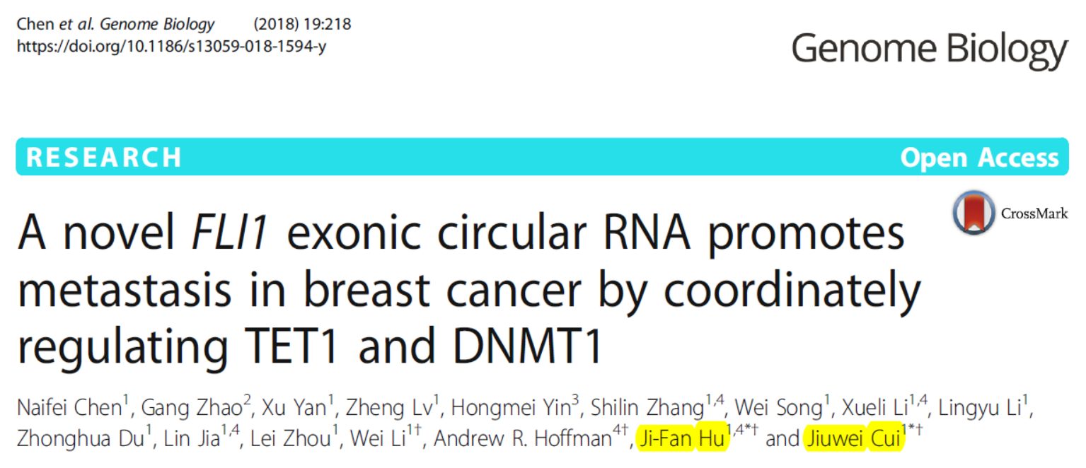 12月11日,Genome Biology(影响因子13.2)杂志在线发表了吉林大学附属第一医院胡继繁和崔久嵬为共同通讯作者的文章,介绍发现来自FLI1基因的circRNA能参与调控基因启动子的甲基化修饰[1]。