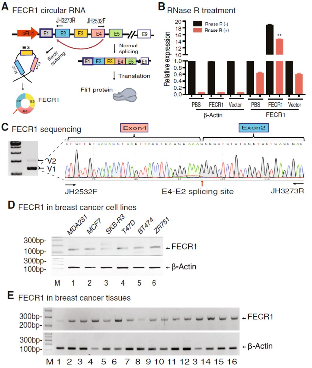 通过RNase R消化实验,Sanger测序进一步鉴定和确认了FECR1的存在,并发现了另一种由外显子2-5形成的circRNA,由于这种circRNA的含量很低,作者没有进一步研究。QPCR分析表明FECR1在乳腺癌细胞系和病人标本中表达较高。