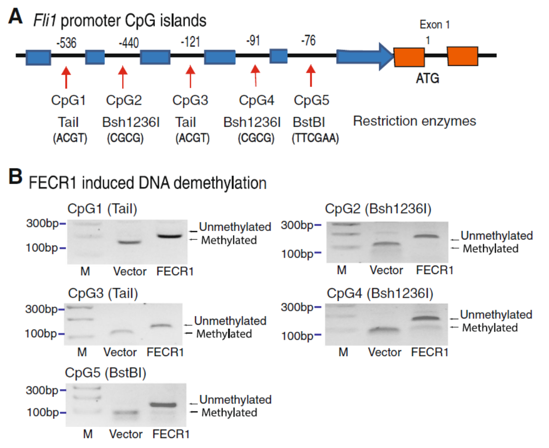 进一步,作者分析了FECR1结合位点的特征,发现FECR1主要结合在FLI1基因启动子的CpG岛。基于多种DNA限制性内切酶分析重亚硫酸盐处理前后的情况,发现FECR1结合后明显降低所结合区域的DNA甲基化状态。该方法类似于基因组分析中用到的限制性片段长度多态性(RFLP)技术。