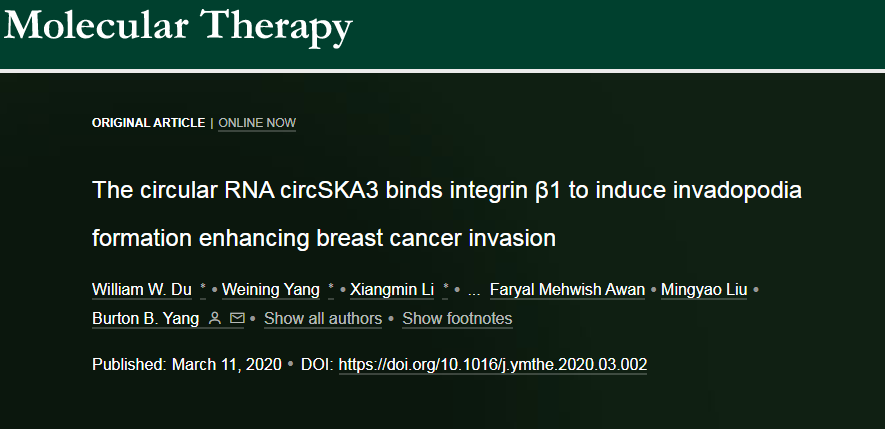 3月11日,Molecular Therapy杂志在线发表了加拿大多伦多大学杨柏华教授的最新研究成果,报道circSKA3可以结合TKS5和Integrin β1,诱导侵袭性伪足的形成,促进乳腺癌转移([1])。