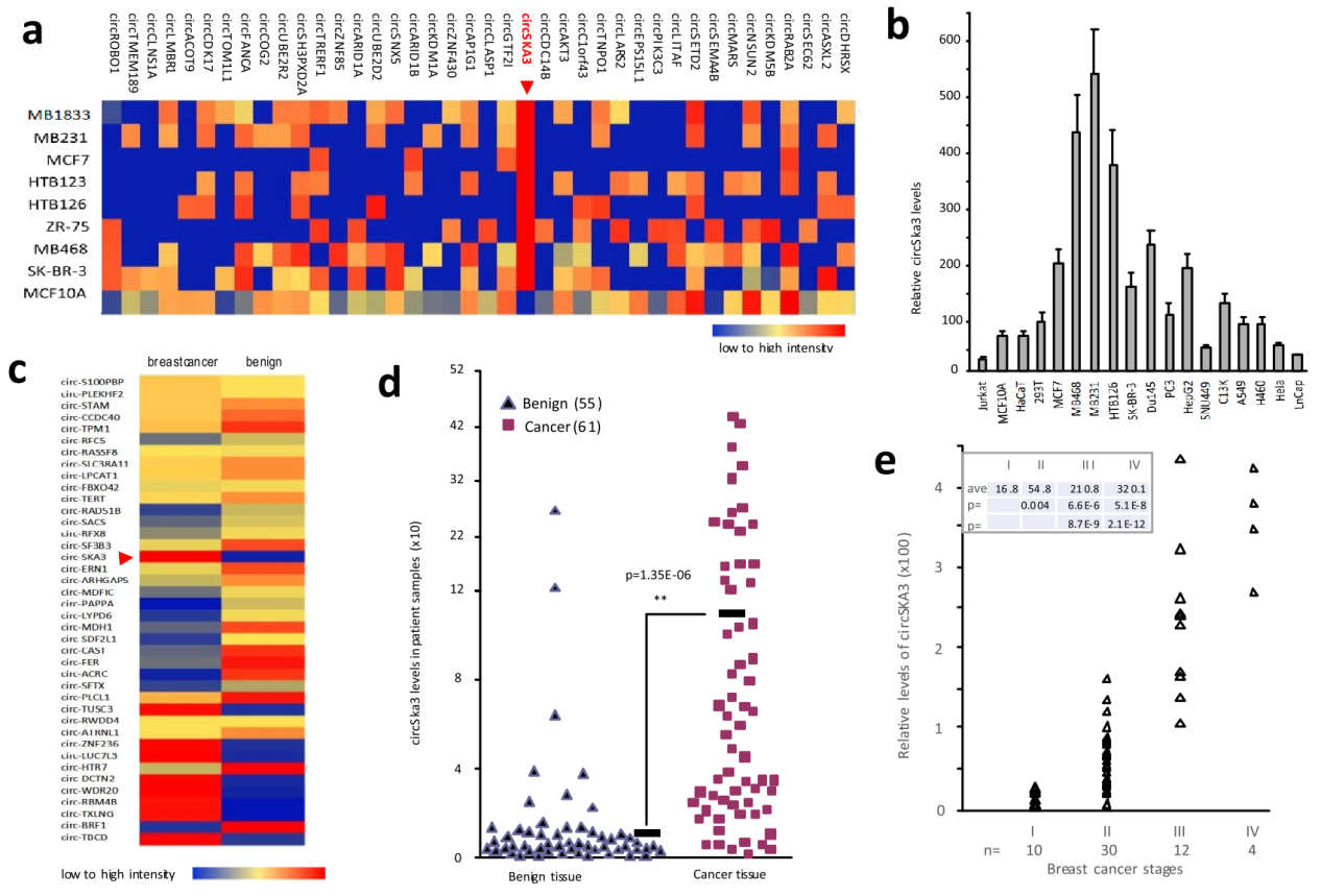 作者从八株乳腺癌细胞系的芯片分析数据中发现circSKA3显著高表达,QPCR在各种肿瘤和非肿瘤细胞系中检测了circSKA3的表达情况,表明circSKA3在乳腺癌细胞系中表达显著高于其他细胞。临床标本检测表明circSKA3在恶性乳腺癌中表达明显高于良性乳腺结节,并且circSKA3的表达与乳腺癌的分期有关,分期越高,circSKA3的表达也越高。