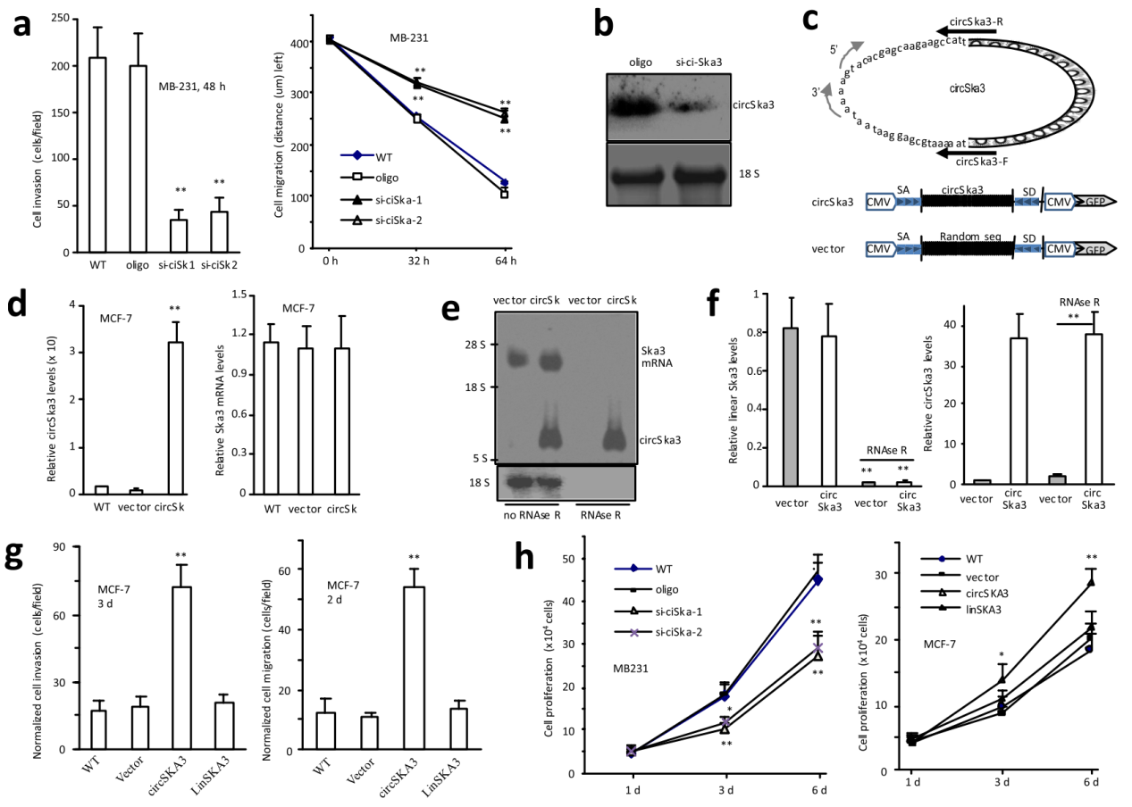 功能分析表明干扰circSKA3可抑制细胞增殖,抑制细胞转移侵袭。过表达circSKA3则促进细胞增殖和迁移侵袭,但过表达不成环的circSKA3序列(linSKA3)没有这些功能,说明是成环后的circSKA3才能促进细胞的增殖和迁移侵袭。