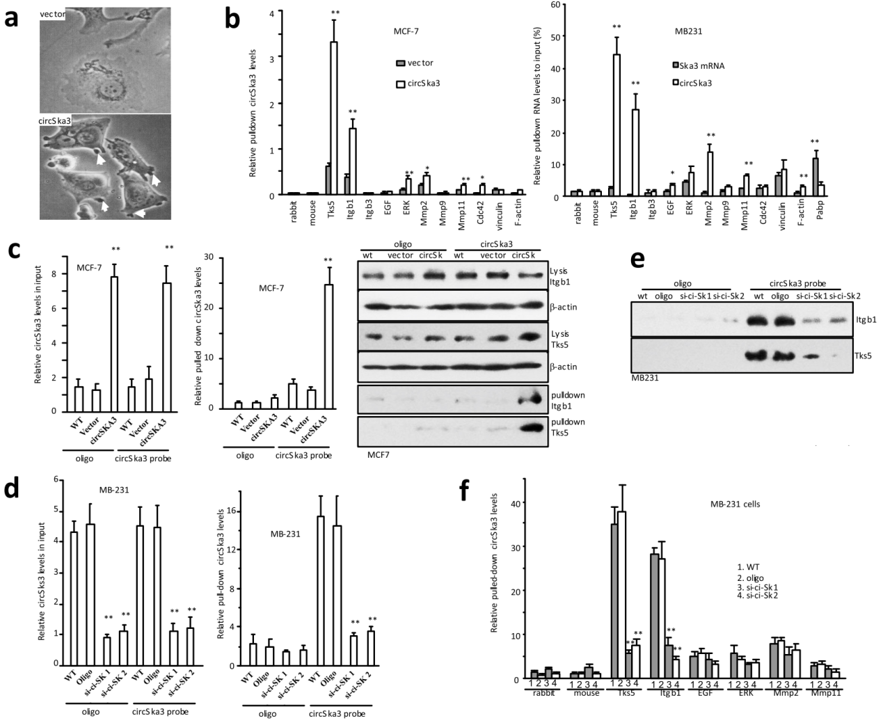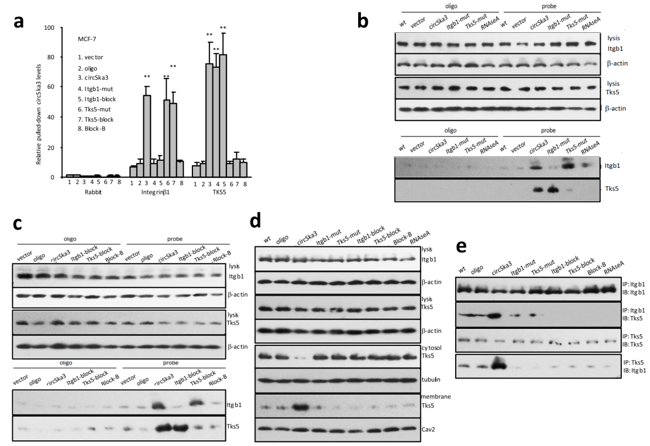 实验中作者发现过表达circSKA3后细胞的伪足增多,用已知的伪足相关蛋白做pull-down分析,结果发现TKS5和Integrin β1(Itgb1)能够明显捕获circSKA3分子,其他的蛋白没有检测到显著的富集作用。pull-down结果也表明TKS5和Integrin β1仅能捕获circSKA3分子,但其对应的SKA3 mRNA富集效果远不如circSKA3,说明这两个蛋白是特异性结合circSKA3的。circSKA3的反义探针也可捕获到TKS5和Itgb1。circSKA3的干扰RNA可抑制这些现象。