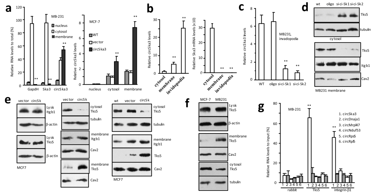 进一步,基于细胞组分的分离和检测,作者发现circSKA3可特异性定位于伪足中,但SKA3的mRNA不具有这个定位现象。circSKA3的干扰RNA还能显著抑制Tsk5在细胞膜和伪足中的定位。过表达circSKA3则促进Tsk5在细胞膜和伪足中的定位。更有趣的是,已知在MB231细胞中circSKA3表达量要高于MCF-7,作者也发现MB231细胞中膜结合的Tks5也多,但两种细胞中Tks5总蛋白并无明显差别,因此circSKA3可能具有促进Tks5定位到细胞膜的功能。