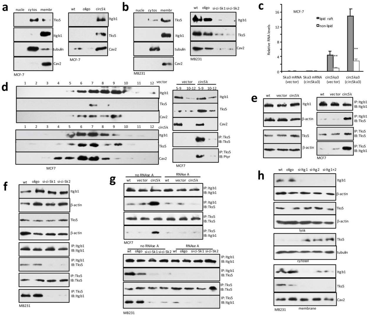 Itgb1往往定位在细胞膜的位置,Tks5可以在细胞膜和细胞质中穿梭定位,circSKA在其中起了什么作用呢?过表达circSKA3促进Tks5定位到细胞膜,也能促进Tks5与Itgb1的相互作用。通过分别设计过表达circSKA3,干扰circSKA3,RNase A处理,干扰Itgb1的实验条件,反复分析circSKA3,Tks5和Itgb1的相互作用关系。