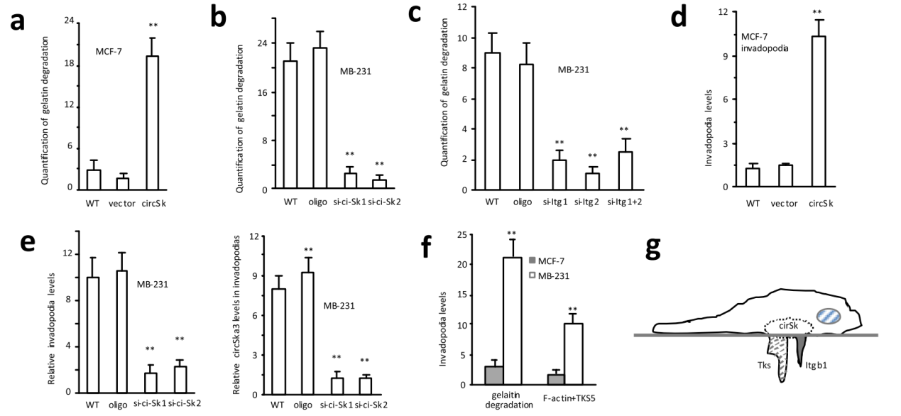 共聚焦显微镜分析gelatin degradation可定量分析侵袭性伪足生成效率。分别设计干扰circSKA3,干扰Itgb1等条件。结果显示circSKA3,Tks5和Itgb1三者的相互作用能够促进侵袭性伪足的形成。