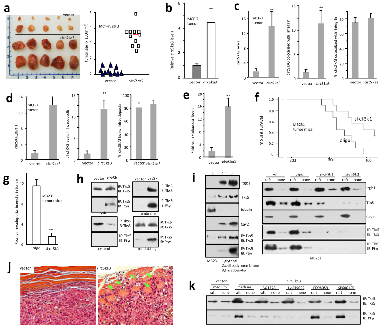最后,MCF-7中过表达circSKA3,MB231细胞中干扰circSKA3后皮下注射构建裸鼠成瘤模型,分析circSKA3与肿瘤增殖和侵袭的关系。结果表明过表达circSKA3后MCF-7肿瘤生长速度明显加快,伪足数目增多。干扰circSKA3后的MB231细胞肿瘤生长显著下降,Tks5定位到细胞膜的比例降低。