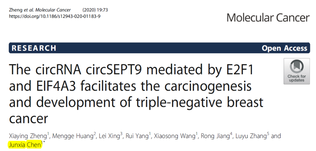 1. Xiaying Zheng, M.H., Lei Xing, Rui Yang, Xiaosong Wang, Rong Jiang, Luyu Zhang, Junxia Chen, The circRNA circSEPT9 mediated by E2F1 and EIF4A3 facilitates the carcinogenesis and development of triple-negative breast cancer. Molecular Cancer, 2020.