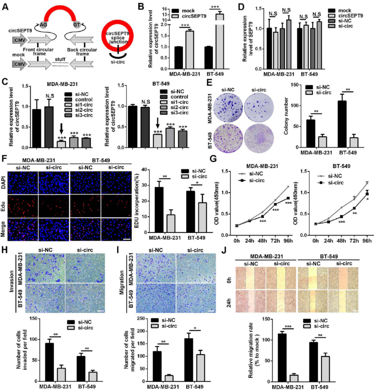 MDA-MB-231和BT-549细胞中干扰circSEPT9可抑制细胞的增殖,迁移和侵袭。