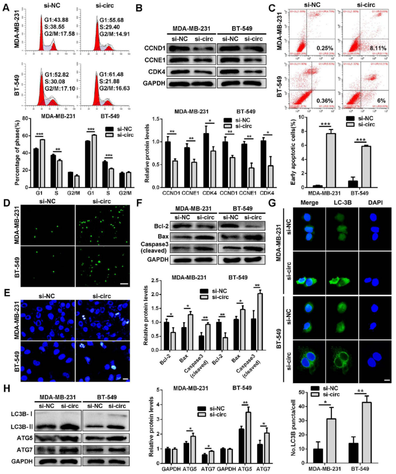 为探索circSEPT9在三阴性乳腺癌中的功能机制,作者分析了干扰circSEPT9后细胞周期的变化情况。结果发现干扰circSEPT9后可诱导细胞周期的G0/G1期阻滞,导致CCND1,CCNE1,CDK4等周期蛋白的表达下降。细胞凋亡检测结果表明干扰circSEPT9后可增加凋亡细胞的比例。