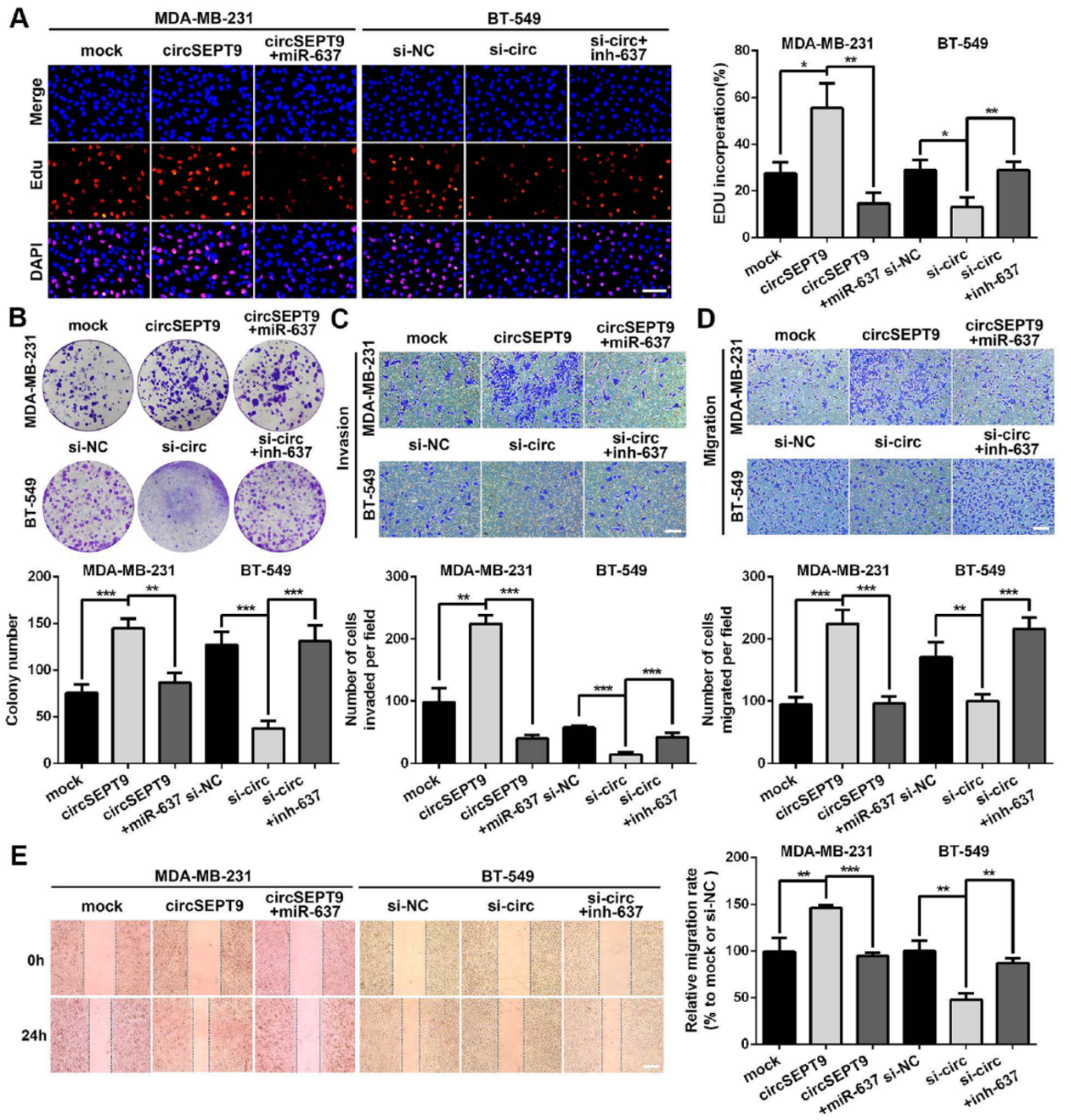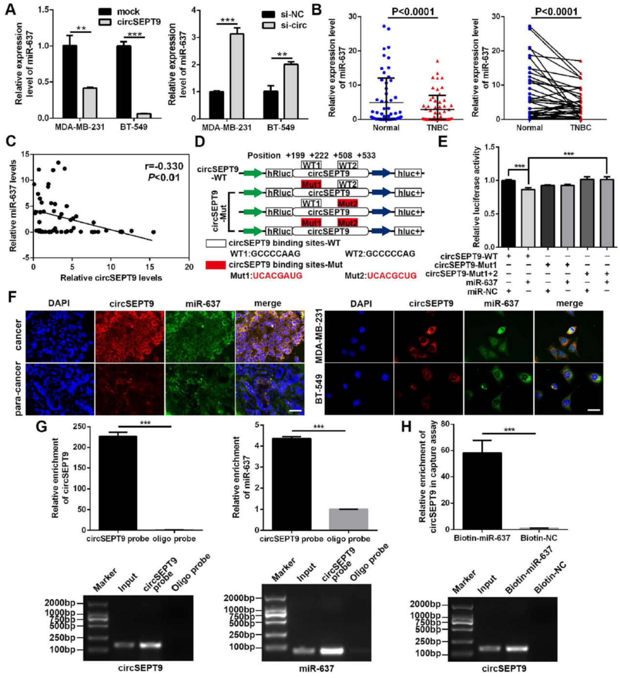 进一步,作者还分析了干扰或过表达circSEPT9后过表达miR-637的效应,结果显示,miR-637过表达能抑制circSEPT9的作用。