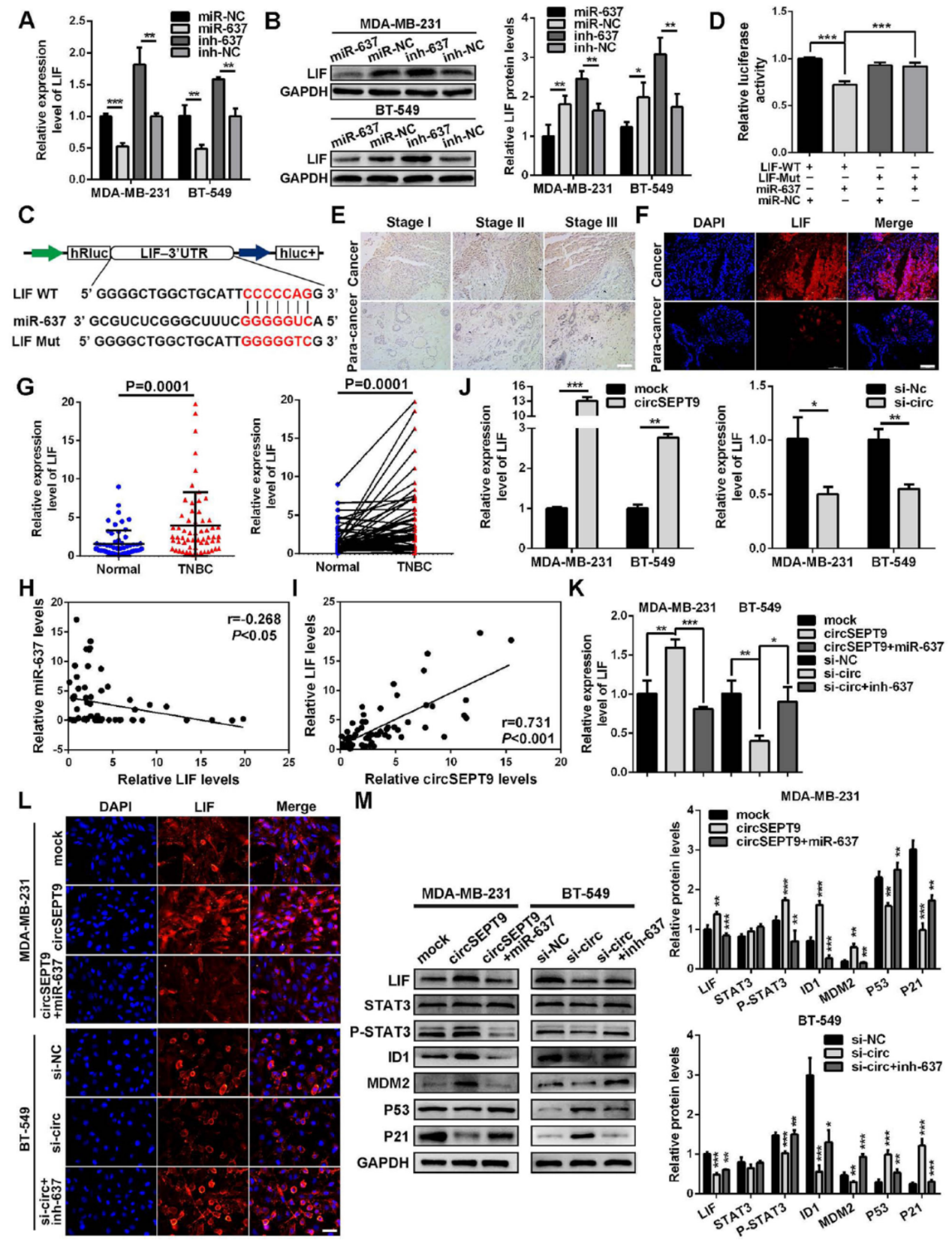 预测分析表明LIF是miR-637的下游靶基因,过表达miR-637后LIF表达显著下降。荧光素酶报告基因,临床标本表达相关性分析实验均验证了三阴性乳腺癌中miR-637与LIF的相反变化关系和调控作用。干扰或过表达circSEPT9能抑制miR-637的作用。