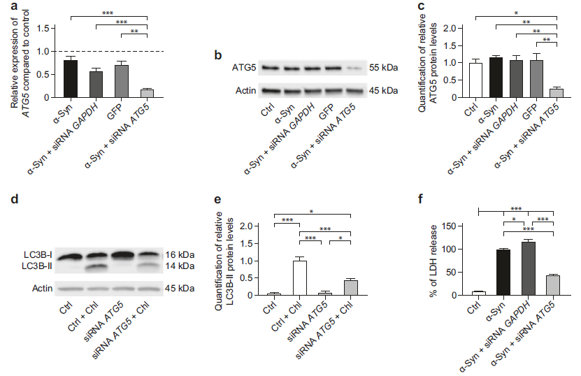 相比于(α-Syn过表达组,GAPDH siRNA组,GFP过表达组),(α-Syn过表达+ ATG5 siRNA)组的ATG5的mRNA表达和蛋白水平明显下调(a-c);LC3B-I经磷脂酰乙醇胺连接后变成LC3B-II,作为自噬体的marker,可用于动态观察胞内的自噬流。细胞经氯喹(chloroquine)处理抑制自噬体融合溶酶体后,LC3B-II的蛋白水平明显上调,说明胞内存在正常的自噬流。而ATG5 siRNA+氯喹可以降低LC3B-II的蛋白水平,说明ATG5 siRNA可以抑制自噬体的形成(d-e)。通过定量细胞上清中的LDH释放水平检测ATG5 siRNA对于细胞活性的影响,相比于(α-Syn过表达组,α-Syn过表达+GAPDH siRNA组),α-Syn过表达+ATG5 siRNA组的LDH水平明显降低,代表其细胞毒性明显减小(f)。
