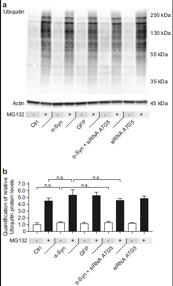 给予10 μM MG132处理细胞4h,可抑制UPS,导致泛素蛋白的水平增加。假如α-Syn过表达+ATG5 siRNA组的细胞毒性减小是因为活化了UPS的话,无论给不给予MG132处理,ATG5 siRNA处理都会导致ubiquitin蛋白的水平增加。但是作者发现α-Syn过表达+ATG5 siRNA组的ubiquitin蛋白的水平并没有明显低增加,说明ATG5 siRNA处理并没有活化UPS途径(a-b)。