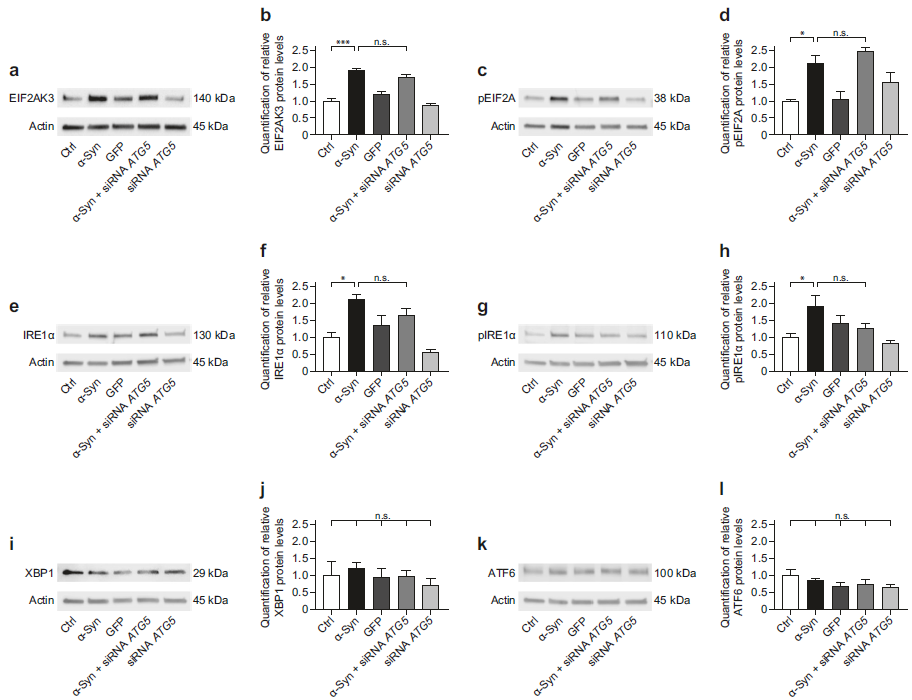 未折叠蛋白反应UPR是一种弃掉错误折叠蛋白的系统,可以被累积在内质网内的错误折叠蛋白所活化,可通过三种应激感应器感应(真核翻译起始因子2 alpha激酶3(EIF2AK3),肌醇必需酶1α(IRE1α)和激活转录因子6(ATF6)。α-Syn过表达可以增加EIF2AK3、pEIF2A 、总IRE1α、pIRE1α的蛋白水平,而ATG5 siRNA处理在此基础上并没有增加EIF2AK3 、pEIF2A、总IRE1α、pIRE1α的蛋白水平(a-h)。α-Syn过表达或者ATG5 siRNA处理都不会影响到XBP1和ATF6蛋白水平(i-l)。这提示α-Syn过表达+ATG5 siRNA处理不会激活补偿性的UPR。