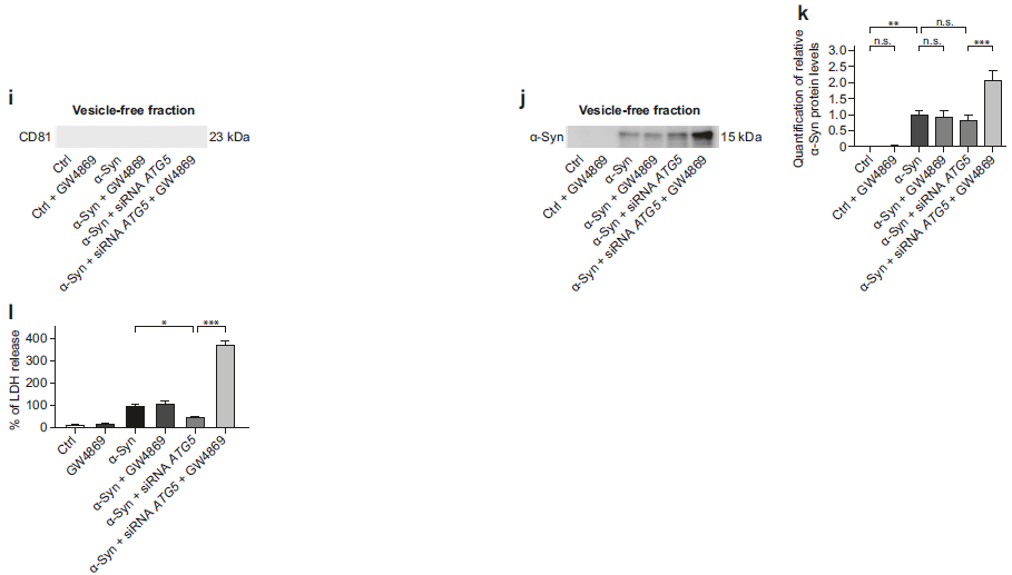 α-Syn过表达四天后可在细胞上清中检测到α-Syn蛋白的分泌,再给予ATG5 siRNA处理后,α-Syn过表达细胞会增加分泌α-Syn蛋白到细胞上清中(a, b);α-Syn过表达会明显增加胞内α-Syn蛋白的表达,但是给予ATG5 siRNA沉默ATG5或者GW4869抑制外泌体分泌后,胞内α-Syn蛋白并没有累积的更多(c, d); α-Syn过表达会明显增加从上清中分离的胞外囊泡部分中的CD81和α-Syn蛋白水平,再给予ATG5 siRNA处理后CD81和α-Syn蛋白水平进一步增加了,提示经过沉默ATG5处理后外泌体的分泌和其中的α-Syn蛋白分泌都增加了,而再同时给予GW4869刺激,这种蛋白进一步增加的现象就消失了(e-h);同时作者也对上清分离的非囊泡部分进行了WB检测,发现无CD81蛋白的存在,说明这部分确实是非囊泡蛋白,而且无论α-Syn过表达处理还是ATG5干扰,都无法增加上清非囊泡部分的α-Syn蛋白分泌,而给予GW4869刺激后α-Syn蛋白分泌增加(i-k),提示抑制自噬后,细胞通过外泌体分泌α-Syn蛋白增加,但当自噬和外泌体分泌都被抑制后,细胞直接释放α-Syn蛋白到上清中。原本沉默ATG5可以减轻α-Syn过表达造成的细胞毒性,但是同时给予GW4869抑制外泌体分泌后,无法减轻α-Syn过表达造成的细胞毒性(l),提示外泌体分泌α-Syn蛋白,对于减轻α-Syn累积造成的细胞毒性是非常的重要。