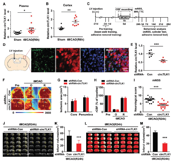 作者通过在建立短暂的大脑中动脉闭塞小鼠模型tMCAO后,对比假手术组和缺血梗死组的组织中circRNA表达谱差异,筛选出缺血梗死组组织中表达上调水平较高的circTLK1。RT-qPCR验证发现circTLK1在小鼠众多器官中表达,尤其在脑、脾和肺的表达水平较高。同时在小鼠血浆和梗死同侧皮质中发现表达上调的circTLK1,而TLK1 mRNA和蛋白水平却出现下降。为了研究circTLK1在缺血性中风疾病过程起什么作用,作者构建circTLK1 shRNA慢病毒载体注射到小鼠侧脑室,IF验证病毒转染神经元成功,RT-qPCR验证体内敲低效果明显,3周后在小鼠身上建立tMCAO缺血再灌注模型,结果显示敲低circTLK1表达虽然不影响到脑血流量和缺血面积,但是会明显减轻神经功能缺陷症状(表现为神经系统缺陷评分降低),减少缺血再灌注后脑梗死体积。
