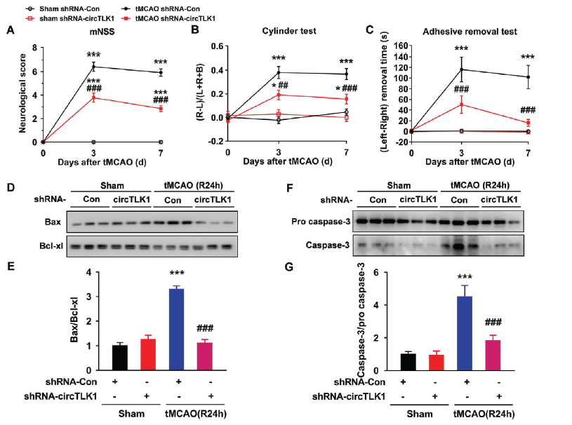 为了详细评估circTLK1对于小鼠中风后神经功能缺陷的影响,作者采用三个实验(神经系统缺陷评分、粘合剂去除试验和圆筒试验)进行评估tMCAO后第0, 3天和7天小鼠的早期症状。体内敲低circTLK1表达可明显减轻tMCAO后神经功能缺陷的症状(神经系统缺陷评分降低)和改善躯体感觉功能(粘合剂去除试验和圆筒试验)。而且敲低circTLK1表达可以明显减轻由tMCAO导致凋亡相关蛋白Bax/Bcl-xl和caspase-3/pro caspase-3比例上调的情况。