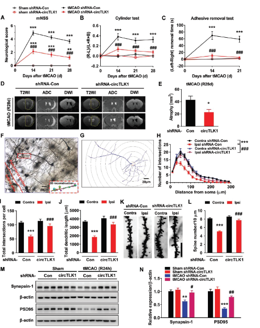 接着在评估tMCAO后第0, 14, 21和28天小鼠的晚期症状,发现敲低circTLK1表达依然可以改善tMCAO后神经功能缺陷的症状和改善躯体感觉功能,同时还可以减轻第28天脑萎缩的情况,增加梗死周边皮质的树突复杂性和树突棘的数目,rescue原本由tMCAO导致突触蛋白synapsin-1和PSD95蛋白水平下调的情况。