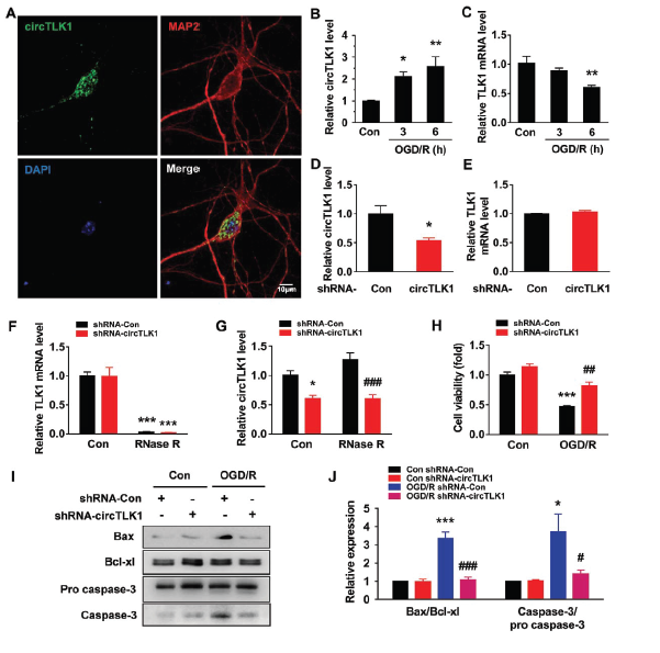 在脑部众多细胞中,原代皮质神经元细胞中circTLK1的表达水平较高。神经元细胞经缺氧无糖后再灌注(OGD/R)处理模拟体内缺血再灌注后,circTLK1的表达水平明显上调,而TLK1 mRNA表达水平则下调。体外转染circTLK1 shRNA慢病毒可明显并特异地敲低circTLK1的表达,但不影响TLK1 mRNA表达。OGD/R处理可促进神经元细胞死亡,而同时敲低circTLK1表达则促进其存活。WB实验也证明了敲低circTLK1表达可明显降低Bax/Bcl-xl和caspase-3/pro caspase-3比例。