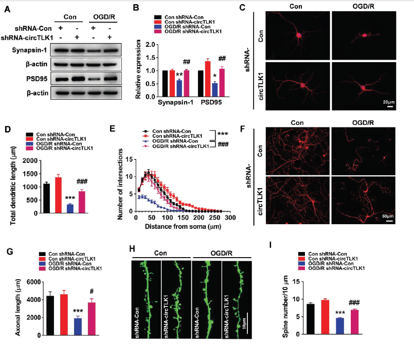 为了评估敲低circTLK1表达对于突触蛋白synapsin-1和PSD95的影响,转染circTLK1 shRNA可以明显上调OGD/R处理后神经元细胞中synapsin-1和PSD95蛋白水平,维持神经元marker– MAP-2水平和神经元突起的长度,保持轴突的长度和树突棘的数目,这些提示敲低circTLK1的表达对于神经元功能的维持和保护有重要的意义。