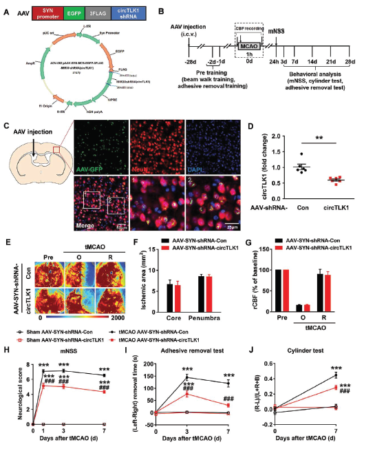 作者构建含circTLK1 shRNA序列的腺病毒,注射到小鼠侧脑室,特异性敲低神经元circTLK1的表达,用于动态观察circTLK1在脑中风发生过程中的作用。特异性敲低神经元circTLK1的表达,虽然不影响到脑血流量和缺血面积,但是会明显减轻tMCAO后第3, 7天的神经功能缺陷症状和改善躯体感觉功能。