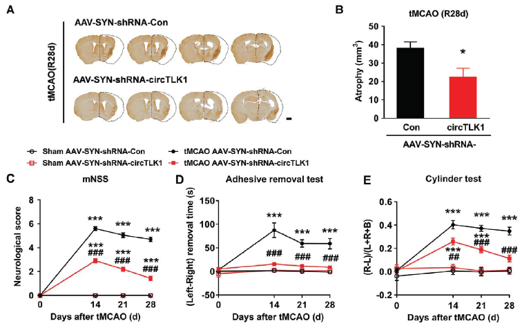 通过观察tMCAO后第14, 21和28天小鼠晚期症状,发现敲低神经元circTLK1的表达可明显减轻脑萎缩的症状,还可以改善神经功能缺陷症状和躯体感觉功能,进一步提示敲低神经元circTLK1的表达对于中风早期和晚期的重要保护意义。