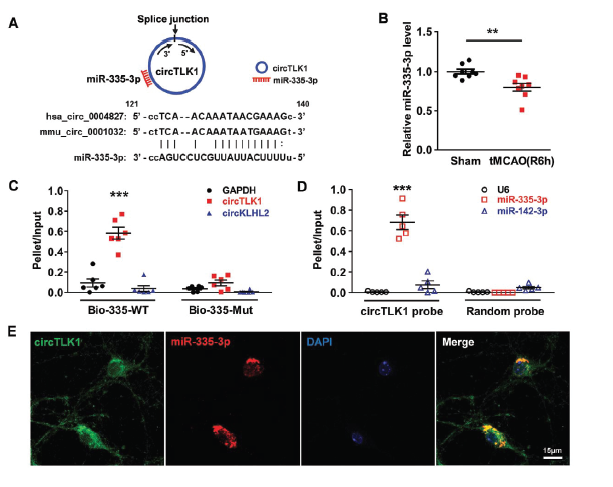 通过对比tMCAO组和假手术组的小鼠脑组织mRNA表达谱,发现脑梗死区域和周边区域的TIPARP mRNA水平明显下调。已有研究报道过,TIPARP参与缺血性脑损伤的发生过程。下一步作者通过数据库寻求靶向TIPARP和circTLK1的miRNAs,只有miR-335-3p, miR-320-3p 和miR-129-5p这三个候选分子。而经tMCAO后6h后缺血皮质中miR-335-3p的表达水平是明显下调的。那miR-335-3p与circTLK1是否存在结合作用呢?RNA-pull down证明miR-335-3p可以富集并结合circTLK1;而反向亲和分离实验证明circTLK1也可捕获并富集miR-335-3p。FISH实验证明miR-335-3p与circTLK1共定位于原代皮质神经元的胞浆中。