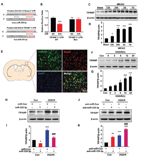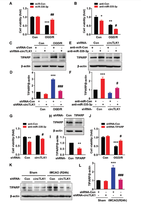 另一方面,那miR-335-3p与TIPARP是否存在结合作用呢?经数据库预测TIPARP mRNA 3’-UTR区域包含miR-335-3p结合位点。同时luciferase报告基因实验证明miR-335-3p与TIPARP 3’-UTR存在相互结合作用。体内实验发现经tMCAO处理12h 至第7天,缺血组织中TIPARP水平明显上调。经OGD/R处理后 ,皮质原代神经元中TIPARP表达水平也明显上调。另外,无论是否给予OGD/R处理,同时过表达miR-335-3p时,神经元中TIPARP表达水平则明显下调;当抑制miR-335-3p表达时,则出现相反的结果。这些结果提示circTLK1/miR-335-3p/TIPARP调控轴的存在。