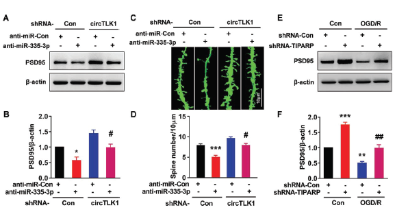 敲低miR-335-3p表达下调PSD95蛋白水平和降低树突棘密度的效应,会被敲低circTLK1表达所逆转。另外敲低TIPARP表达可逆转OGD/R处理所诱导PSD95蛋白下调的效应。体外OGD/R模型的基础上利用rescue实验验证circTLK1/miR-335-3p/TIPARP轴的相互调控关系。