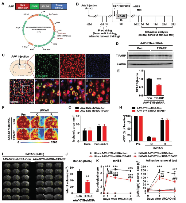 构建含TIPARP shRNA序列的腺病毒注射入小鼠侧脑室28天后,在神经元中TIPARP表达可被特异性敲低。接着诱导tMCAO后,发现脑血流量和缺血面积不受影响,但是脑梗死体积明显减少,神经系统缺陷评分和躯体感觉功能得到明显改善。