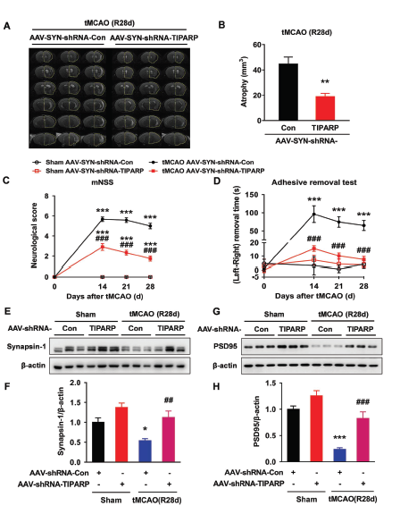 经过长期观察(tMCAO后第28天),TIPARP敲低组小鼠脑萎缩的情况得到明显的改善,神经系统评分和躯体感觉功能也得到明显改善。原本在tMCAO后突触相关蛋白synapsin-1 和PSD95表达下调的情况,在同时敲低TIPARP表达后,这两种蛋白出现明显上调。