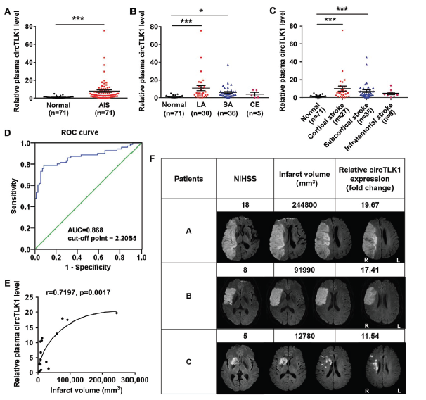 相比于健康人群,患有急性缺血性中风AIS的病人血浆中circTLK1表达水平出现明显上调。AIS疾病分为大动脉粥样硬化LA, 小动脉阻塞SA, 和心源性栓塞CE三种亚型,而只有LA和SA亚型患者血浆中circTLK1表达水平出现明显上调。通过对比发生中风的不同部位,发现只有患有皮质和皮质下梗死的患者血浆中circTLK1表达水平出现明显上调。ROC曲线分析显示circTLK1可能作为临床诊断AIS和提示AIS严重程度的重要标志物,而且AIS患者发生梗死面积越大,其circTLK1表达水平越高。